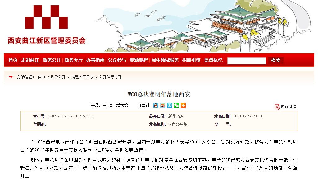 大河报·大河财立方《创见》记者在西安曲江新区管理委员会官网上查询发现,按照WCG与中国西安市曲江新区签署的MOU内容,WCG 2019的举办城市确定为中国西安市,而西安市曲江新区将成立WCG相关团队来全力支持WCG的成功举办。