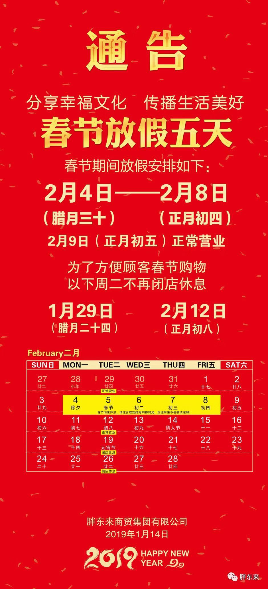 另外,在2019年1月14日,胖东来官方微信平台公布了其2019年春节期间放假安排(2月4日至2月8日)。以外,为了方便顾客春节购物,1月29日(腊月二十四)和2月12日(正月初八)不再闭店休息。