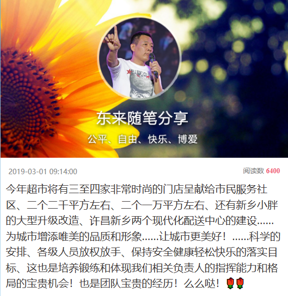 今年超市将有三至四家非常时尚的门店呈献给市民服务社区、二个二千平方左右、二个一万平方左右、还有新乡小胖的大型升级改造、许昌新乡两个现代化配送中心的建设……为城市增添唯美的品质和形象……让城市更美好!……科学的安排、各级人员放权放手、保持安全健康轻松快乐的落实目标、这也是培养锻练和体现我们相关负责人的指挥能力和格局的宝贵机会!也是团队宝贵的经历!么么哒!