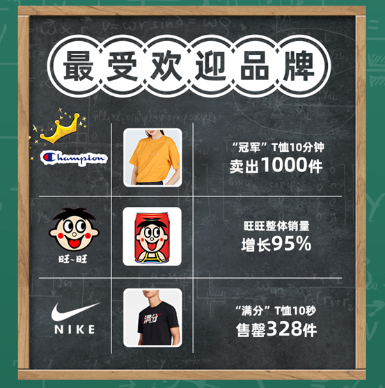 除此之外,Champion(冠军)受欢迎的程度也很高,爆款T恤6月1日零点过10分,卖出1000件。有网友调侃,“在硬实力之外,讨个好头彩,也可以增加学生的信心。”