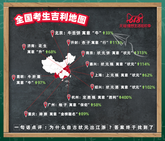 吃杏,会“幸运”,吃蹄膀会“金榜题名”……除了“高粽”,各种谐音或者寓意吉利的产品在天猫戳中了广大考生希望好运的心理。天猫数据显示,在河南区域,尤其是开封人,最爱吃杏子,寓意“行”、“幸运”,近半月销量同比增长113%。