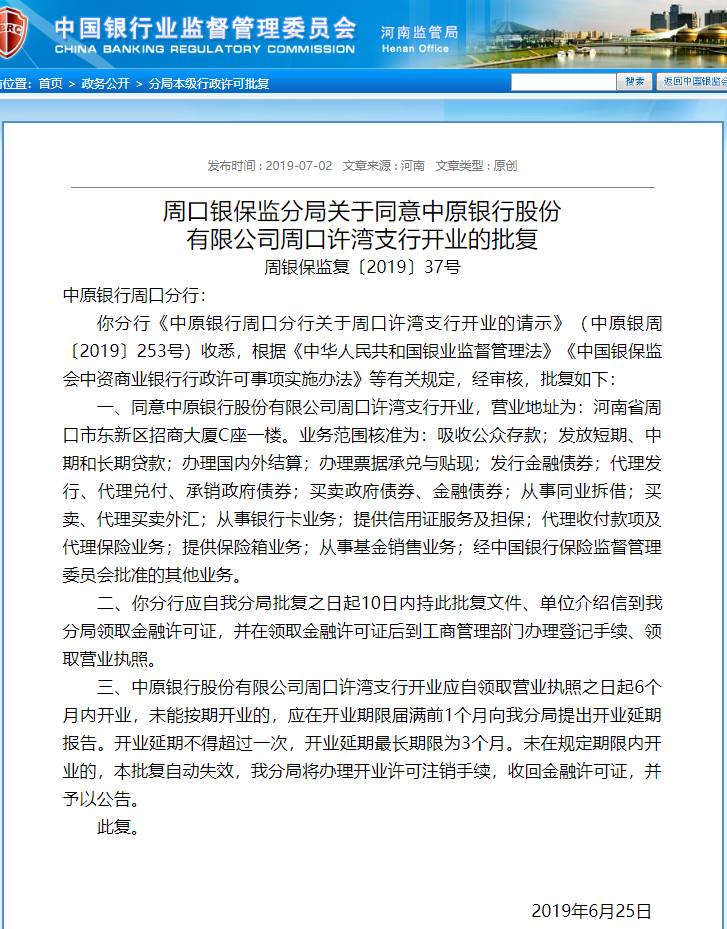 大河财立方消息 7月2日,周口银保监分局发布关于同意中原银行股份有限公司周口许湾支行开业的批复。