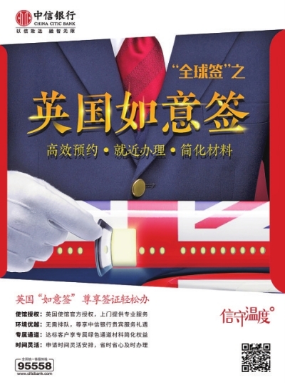 中信银行与英国使馆紧密合作,今年全新升级了英国“如意签”服务:赴英申请者只需在中信银行开立符合相关条件的存款证明,即可享受减免申请签证材料的专属绿色通道。全新升级后的服务,让国人赴英变得更简单。