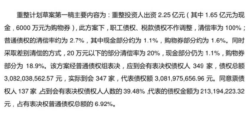 此前,富贵鸟两度提交重整计划草案。重整计划草案第一稿主要内容为重整投资人出资 2.25 亿元(其中 1.65 亿元为现金,6000 万元为购物券)。
