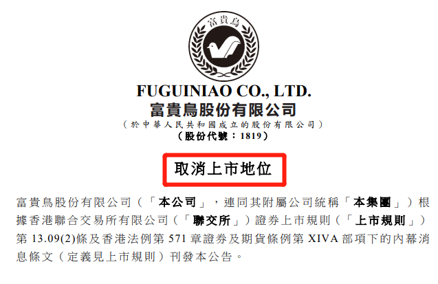值得一提的是,富贵鸟的上市地位同日(8月26日)上午9时起取消。