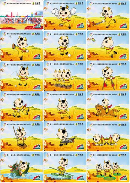 纪念卡共3种74张,分别是:“第十一届全国少数民族传统体育运动会”主题宣传版绿城通纪念卡、运动项目版绿城通纪念卡和56民族系列绿城通纪念卡。