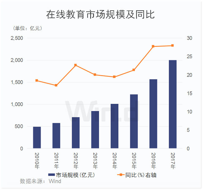 数据显示,近年来,我国在线教育市场规模快速增长,从2010年的不足500亿元,上涨至2017年的超过2000亿元,近几年复合增速均在20%以上。