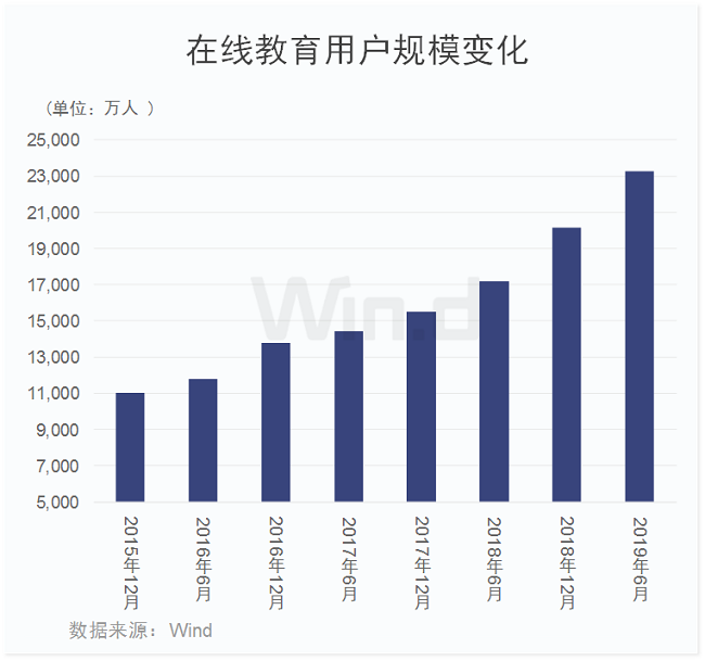 除了市场规模持续攀升外,在线教育用户规模也快速增长。2015年,用户规模达1.1亿人,到了2018年已经突破2亿人,2019年6月份超过2.3亿人,相比2015年底实现翻倍。