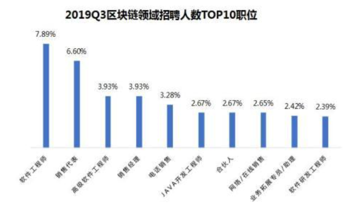 对于真正将区块链技术或产品作为核心业务的企业,技术人才和销售人才都是不可或缺的。报告显示,从行业分布看,2019年三季度,互联网/电子商务和计算机软件行业对区块链人才的招聘需求占所有行业的比例分别为37.14%和14.45%,占需求主流。需求前十的行业还包括IT服务、基金/证券/期货/投资、教育/培训/院校等。