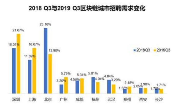报告显示,从2019年第三季度区块链招聘需求的城市分布来看,人才需求主要集中于一线和新一线城市,与人才求职城市分布对应,且人才供给明显更集中在一线城市。