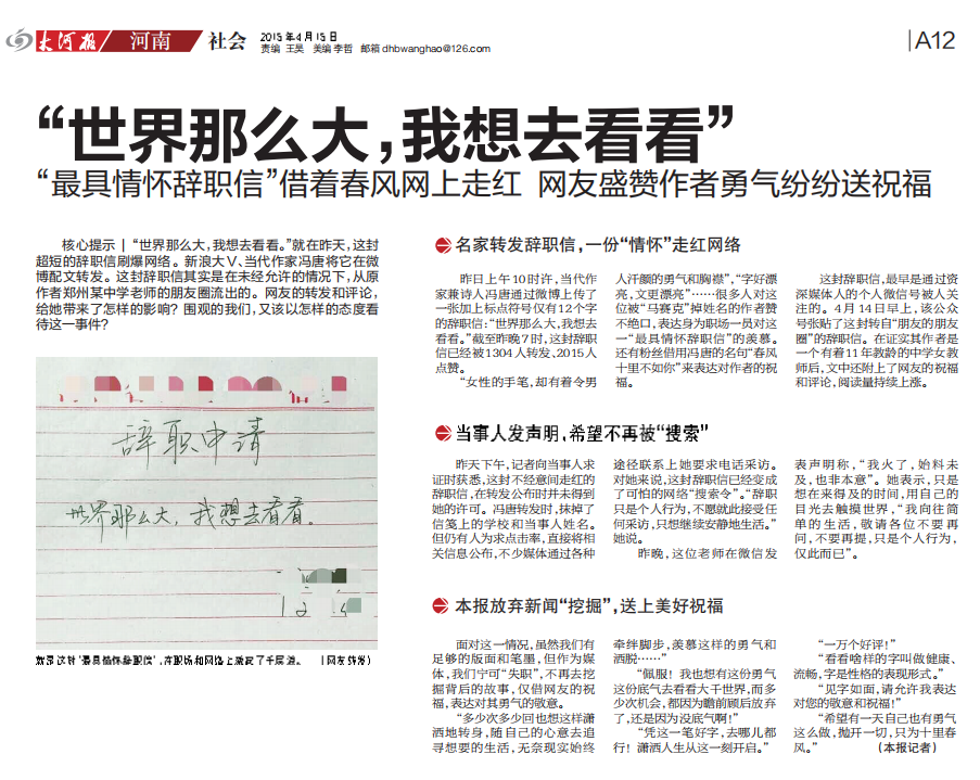 2015年4月14日,河南一中学教师顾少强写下的“世界那么大,我想去看看”走红网络。当天下午,大河报迅速跟进,首发报道。