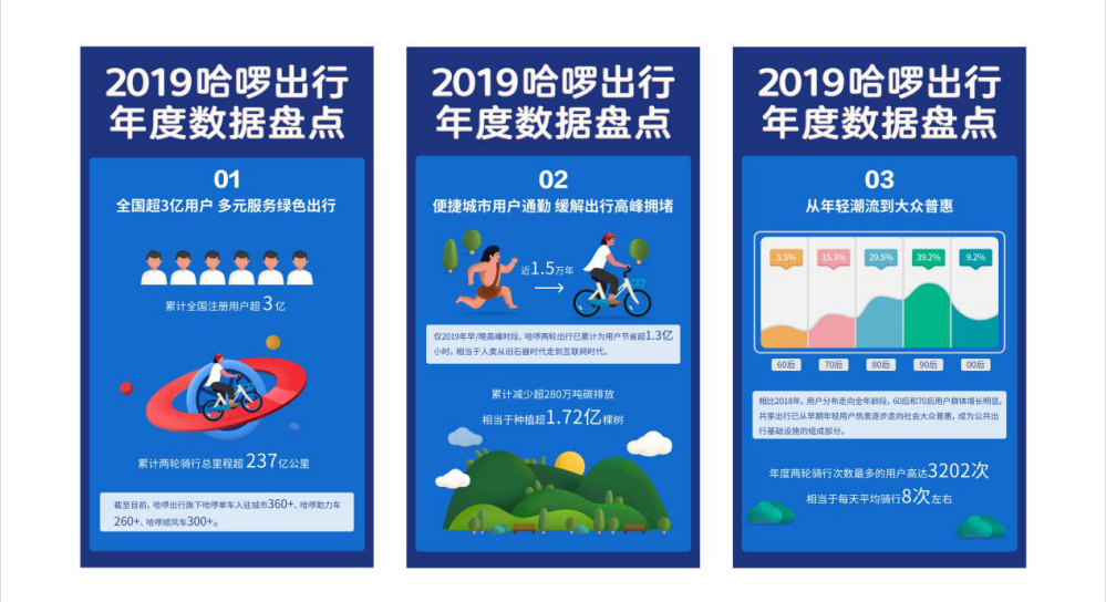 哈啰出行宣布其国内注册用户数已超过3亿,成为共享出行领域“霸主级”选手。1月8日,哈啰出行发布“2019年度数据盘点”称,截至上年年末,该公司的单车、助力车两大业务线,分别入驻国内360、260多个城市,顺风车业务也在全国300多个城市上线。与此同时,其用户群走向全年龄段,60后和70后用户群体增长明显,共享出行逐步成为公共出行基础设施的一部分。