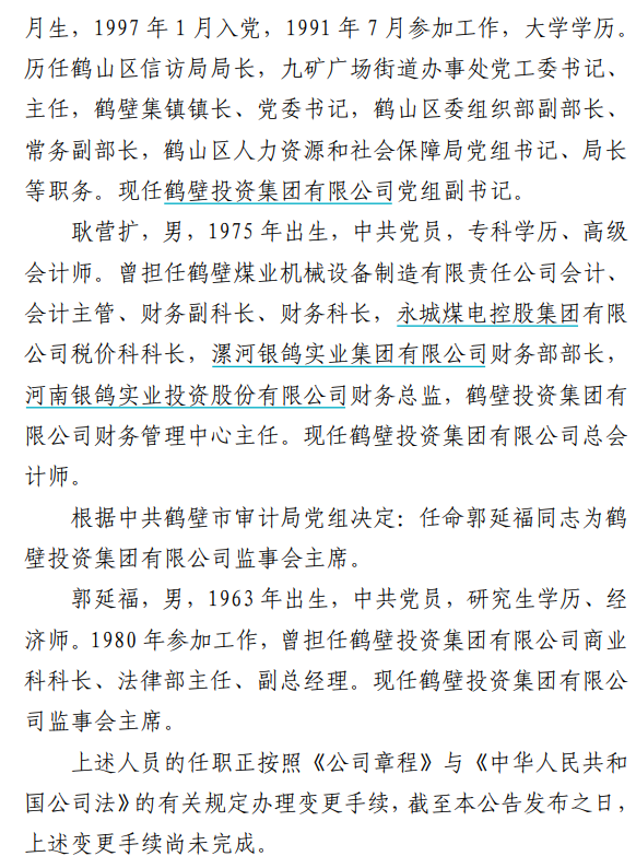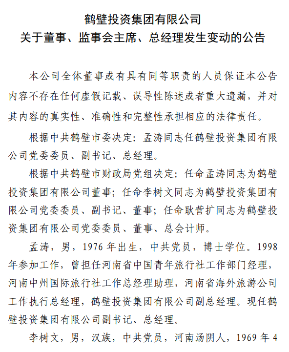 公告显示,根据中共鹤壁市委决定:孟涛任鹤壁投资集团有限公司党委委员、副书记、总经理。