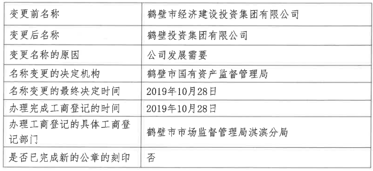 鹤壁投资集团有限公司的前身为鹤壁市经济建设投资集团有限公司。据大河财立方此前报道,2019年11月25日,鹤壁市经济建设投资集团有限公司公告称因公司发展需要,鹤壁市经济建设投资集团有限公司名称变更为鹤壁投资集团有限公司。