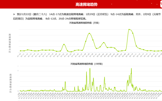 《报告》显示,预计河南省出程较为通畅,无明显拥堵;预计1月22日(腊月二十八) 14点~17点为高速出程拥堵高峰;1月29日(正月初五) 9点~14点为返程高峰,另外,2月9日(元宵节后的周日)为返程拥堵高峰, 8点~12点和20点~24点拥堵程度较高。