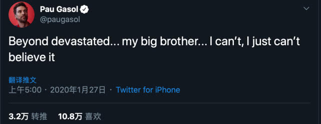作为科比的挚友和最喜欢的队友之一,保罗·加索尔同样表达了自己的看法,“悲伤已经无法表达我的心情…..我的兄弟…..我真的,真的无法相信这件事。”