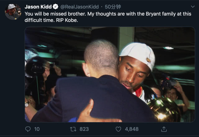 目前担任湖人助教的传奇后卫贾森·基德则放出了了两人深情相拥的旧照,他写道,“兄弟,我会永远纪念你,在这个艰难的时刻,我的信念和科比一家同在,愿灵魂安息,科比。”