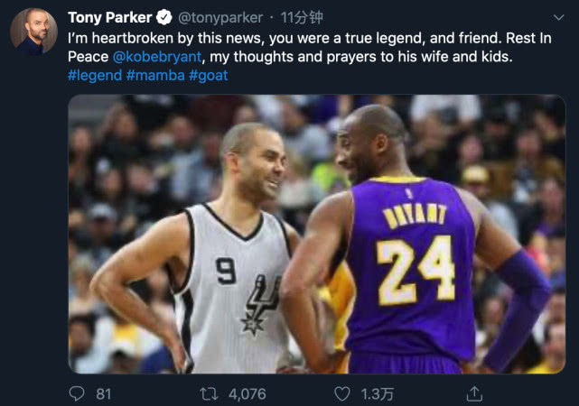 曾和科比多次交手的马刺传奇球星托尼-帕克写道,“我为这些新闻感到心痛,你是一个真正的传奇,也是一个真正的朋友,愿灵魂安息,科比,为他的妻子和孩子们祈祷。”