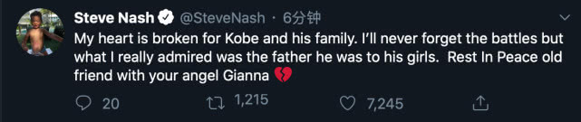 在生涯最后一个赛季和科比搭档后场的传奇后卫史蒂夫·纳什心情沉重:“我为科比和他的家人感到心碎,我永远忘不了彼此的争斗,但我真心欣赏他在女儿面前做的表率,愿灵魂安息,我的老朋友和你的小天使Gianna。”