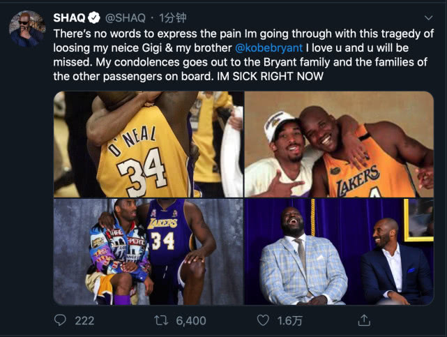 和科比一同为湖人创立三连冠伟业的沙奎尔-奥尼尔很快也在社交媒体上发布声明,并附上了多张和科比的经典合照,“没有任何话语可以表达我此时的痛苦,我经历了痛失兄弟科比·布莱恩特和侄女Gigi的悲剧,我爱你,而我将永远纪念你。我向科比的家属和其他死者的家属致以我的哀悼之情,我现在很难受。”