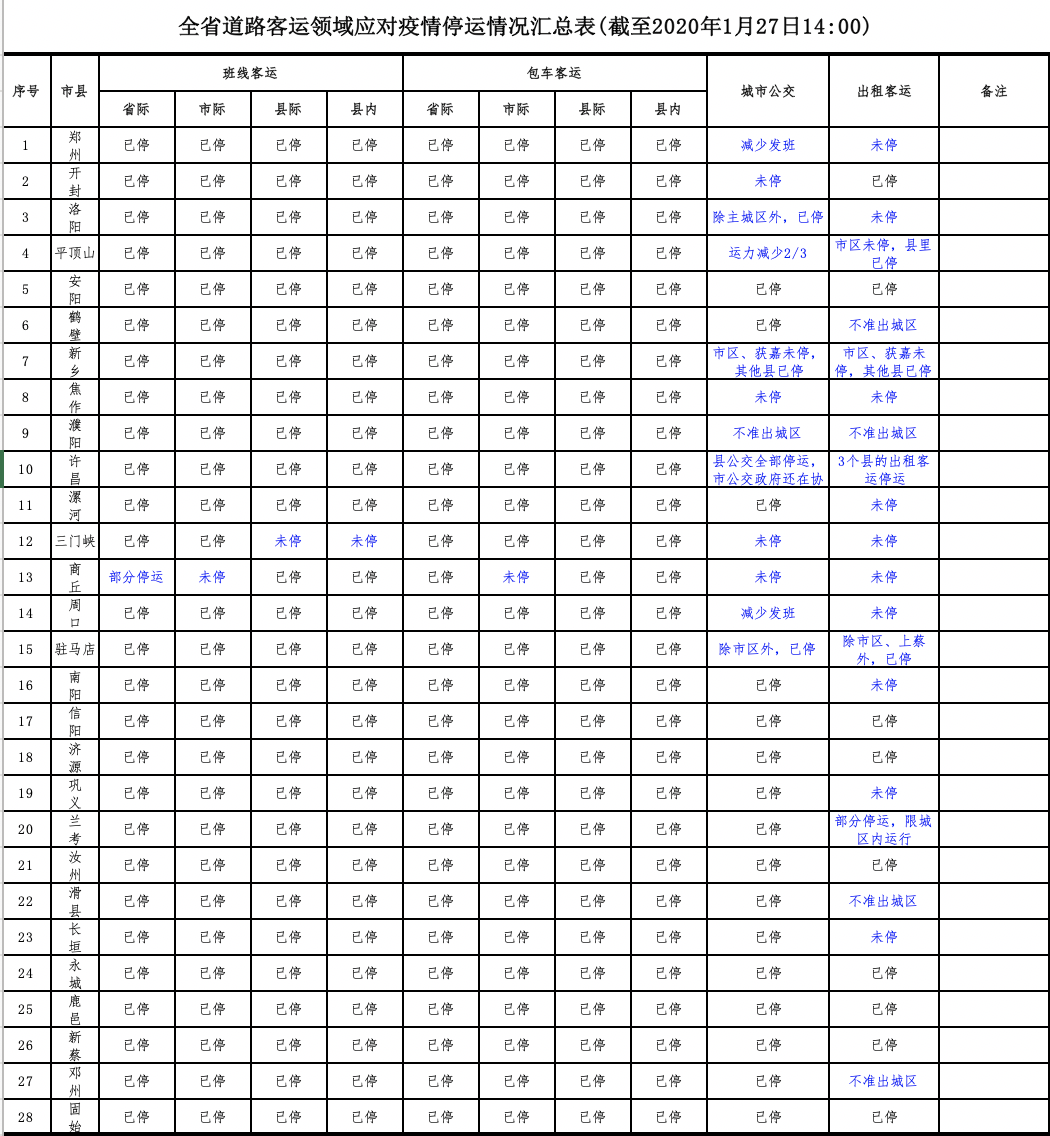 28.新蔡县: 1 月 27日 0时起,济源辖区各类公共交通运营包括省际客运、市际客运、村村通客运、旅游包车、城市公交、网约车、巡游出租车、营运船舶等全部暂停运营。