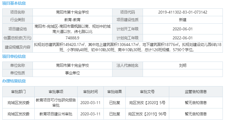 大河财立方消息 3月11日,据河南省投资项目在线审批监管平台消息,南阳市第十完全学校项目教育项目可行性研究报告和教育项目建议书审批结果显示“已批复”。项目估算总投资74888.9万元,计划两年完工。