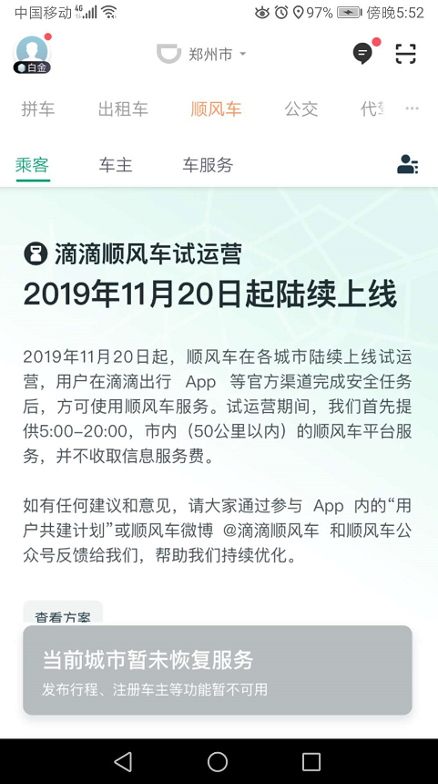 当前,滴滴顺风车业务并未开通郑州市。因而,用户打开该平台顺风车业务仍是一张暂未开通的公告。而“顺路同事”服务的推出,意味着企业主体发起申请开通,滴滴顺风车就解决了进入空白城市的合理性。