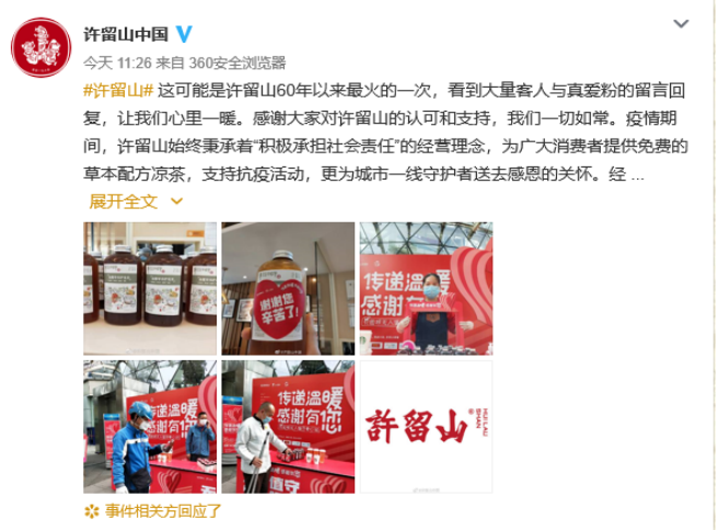 3月13日上午11点26分,许留山官方微博发文称,感谢大家对许留山的认可和支持,“我们一切如常”,并表示“等疫情过去,我们店里见”。同时表示,大陆地区门店并未因此事受到影响,目前大陆地区的许留山门店已经陆续恢复堂食和外卖经营业务。