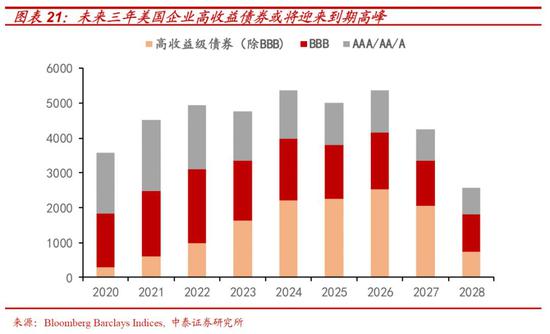且从企业债务到期时间分布来看,未来三年美国企业高收益债券或将迎来到期高峰: 2020-2022年的到期量分别为 4248 亿美元、5305 亿美元、5810 亿美元。这其中,分级别看,BBB 级债券的到期高峰在 2022 年,到期量为 2094 亿美元。整体来看,2020-2022 年投资级债券的到期量占比维持在 75% 左右的高位。