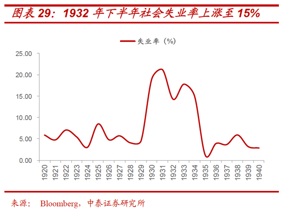 相应地,大萧条中对经济和市场伤害最大,最为痛苦的阶段,也均离不开国会因对赤字率的控制,而做出收紧性质的财政政策(尽管相应时期利率仍处于历史最低水平)。 由于胡佛总统所在共和党在1930年的中期选举中丢掉了国会多数席位,使得财政政策始终“受制于人”,加之其本人对财政的认知并不清晰。1932年6月国会通过的《税收法案》,一方面,上调了包括所得税、公司税、消费税在内的多种税收,一方面,削减联邦开支,以图实现预算平衡。但结果却使得1932年下半年经济极端恶化,消费者支出和工业生产降幅超过20%,失业率上涨至15%以上,且伴随银行倒闭数量不断攀升。