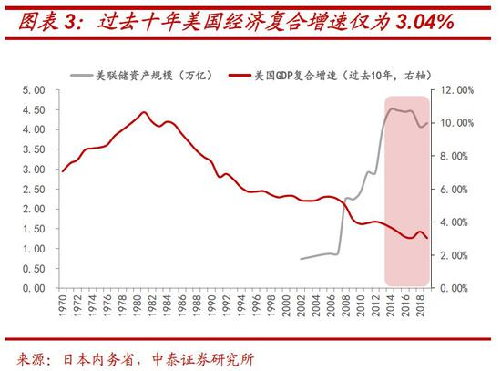 低利率环境下企业和居民借债扩大的另一面是联储和美国政府的扩表。美联储方面,连续降息后濒于零利率的现状,使得降息政策再难有空间。过去10年,美联储购买资产规模扩张了1.93万亿,这意味着,在后续危机由资产价格向实体经济不断传导过程之中,即便美联储进一步实施以购买金融资产为代表的量化宽松QE4,也会面临边际效用递减的窘境。