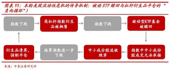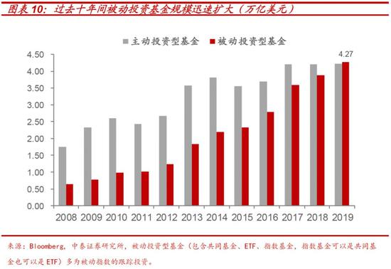 另一方面,“风靡”的被动型基金“跑步进场”。 近十年来,被动投资型股票基金规模迅速扩大,成为推升美股估值的主要力量之一。2019年美国股票基金资产规模达到8.5万亿美元,被动基金资产规模占比51%,已经超过主动型管理基金,达到4.27万亿美元。过去十年牛市造就了被动投资的“风靡”,同样地,一旦市场转向下跌,被动基金面临的巨量赎回所造成的卖盘压力,会使其所跟踪指数中的中小成份股的成交额无法承接,这也会加剧市场流动性的枯竭。