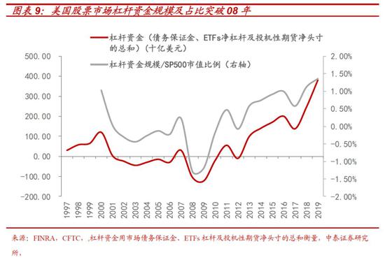 一方面,利用债务保证金、ETFs杠杆及投机性期货净头寸的总和来衡量的股市杠杆总金额约为4000亿美元。按照标普500标准化市值计算,此类杠杆资金占市值比重约1.36%,高于互联网泡沫高峰的1.1%。历史极值化的杠杆资金意味着:一旦遭遇外部冲击,美股开始向下,易引发杠杆资金连锁平仓式的流动性危机,市场估值向均值回归的过程也会异常惨烈。