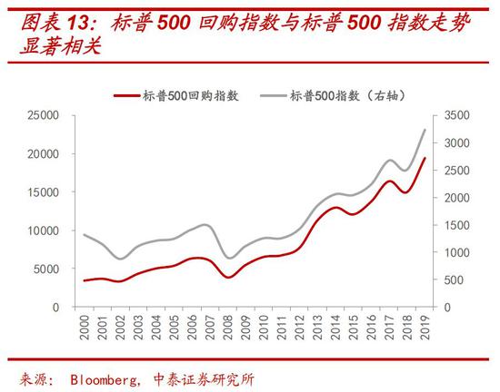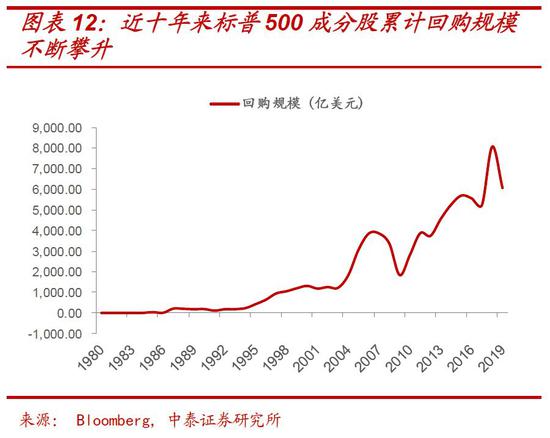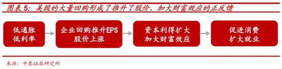 如图5所示:持续低利率环境,使不少公司大幅借钱回购自己的股票,而不是用来投资实业。股价的上涨让企业盈利增厚,从而又提高了分红率,同时也让投资者的资本利得扩大,形成财富效应,进而促进消费、创造更多的就业机会,而这反过来又进一步助推了股价的上涨。
