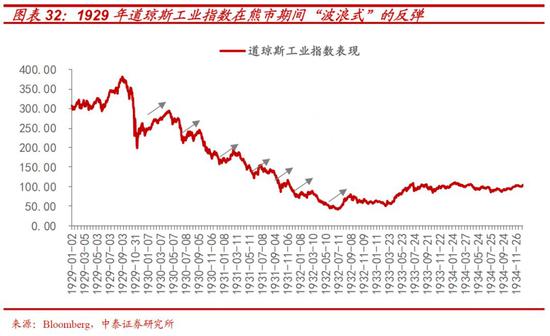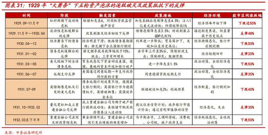 从危机演进过程看,参考1929年大萧条,危机不是一蹴而就的,而是经历了全球资产泡沫逐级爆破的五大阶段。每个阶段之间,政策的抵抗和投资者对短期因素的放大,都造就了平均近30%的五轮季度级别的大反弹 ,而每轮反弹之后,伴随经济基本面的进一步恶化和新风险的引爆都会造成新一波更猛烈的下跌。