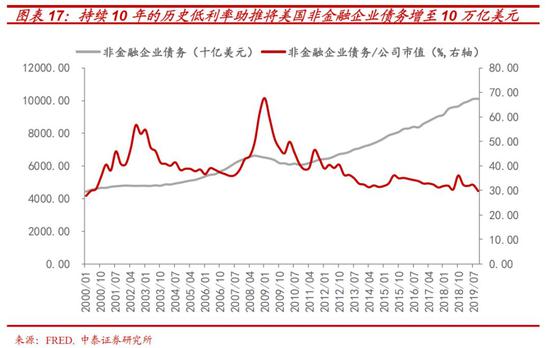 1)从数据上看,持续近10年的低利率,将美国企业债务总额推高至近10万亿美元,非金融企业债务占GDP比重也超过74.4%,这一比重高于2008年房地产泡沫顶峰时的72%。