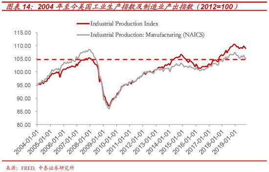以制造业产出指数为例, 过去十年,尽管美股整体涨幅已较08 年危机前的高点高出300%。但美国制造业产出水平较之危机前的2007 年11月依然低2%,工业总产出在过去12 年时间里一共才提升了4%。