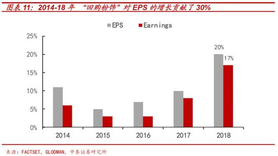从美国上市公司业绩拆分角度看,过去十五年,美国上市公司的每股盈利(EPS)年复合增速为11%,而企业利润复合增速仅为8%,两者间3%的差值就是回购“人为推升”的“增长”。也就是说,当前美股EPS增长之中,公司通过回购股票所贡献的“虚增”占比接近30%,本就与股价涨幅不相匹配的业绩增长之中,还存在着较为明显的“注水”现象。