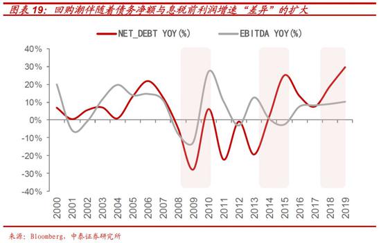 这其中, 17-19年“牛市顶点”进行的高持仓成本加高利息成本的约1.9万亿美元回购,或成为后续“回购危机”的重要“导火线”。 从各个时间段美国上市公司借债回购的金额可以看出,过去十年,美国公司借债回购的高峰主要是三个时间段:09-10年,13-15年以及17年-19年。在最近两轮回购潮中,都伴随着债务净额与息税前利润增速差异的走阔。 这其中,09-10年,13-15年的上市公司大规模回购的背景是危机背景下联储趋于0的低利率,但17年—19年年中,在联储不断加息下,回购规模的持续扩大,则或主要由美股牛市本身的赚钱效应所致。
