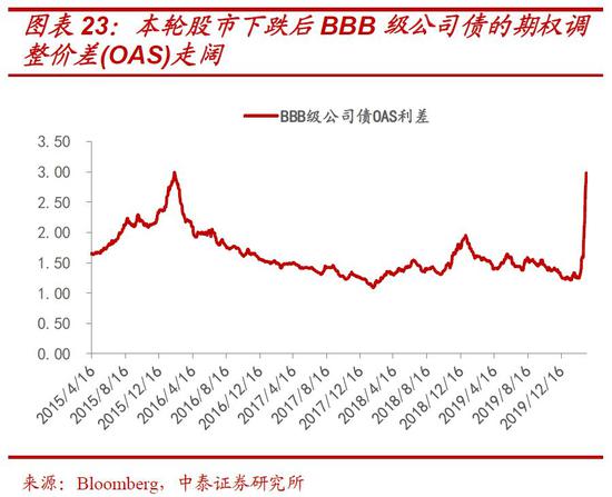 同时,疫情对资本市场及经济的冲击,显著降低了投资者的风险偏好,信用利差会持续扩大,这将进一步加大低评级债务企业资金成本、融资难度和还款压力。 自2月中旬以来,尽管美联储已降息150bp,美国高收益债券收益率却从11.25%提升至16.65%,BBB级公司债的期权调整价差(OAS)从135上升至290bp。