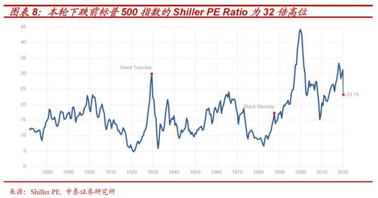 从估值角度看, 以标普500指数的Shiller PE Ratio(按通胀率调整过去十年的利润与股价相比)在本轮下跌前其为32倍左右,超过2008年金融危机的26倍,与“大萧条”前1929年的30倍相当,属于历史高位区间 。即使目前指数下跌幅度已超过30%,当前23.20倍的估值水平,仍处于60%的历史分位数水平(如果考虑我们后文详细描述的回购对每股盈利的“粉饰”,则估值及其历史分位数水平会更高)。也就是说,即便经历四次熔断,美股整体目前也很难说,估值绝对便宜。