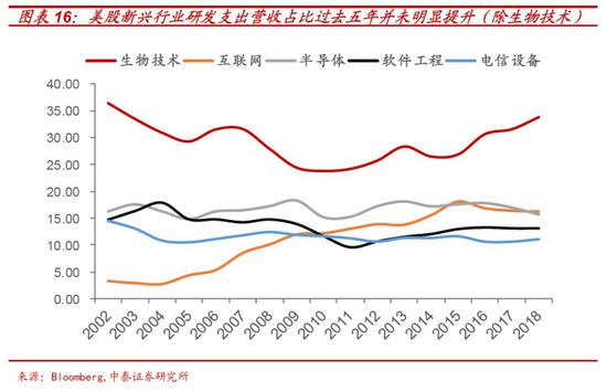 比孱弱的制造业产出更为严重的是:美国企业对于创新投入的下降。企业研发支出占现金比重仅为11%远低于用于股票回购的27%。 从各细分成长行业的研发支出占营收比重看,与五年前相比,除了生物技术(33%)研发支出占比保持增长外,包括互联网、半导体(研发占比15%)、软件及消费电子(12%)等在内的行业研发支出占比均没有明显的提升,甚至略微下降。