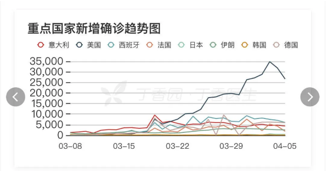 根据丁香医生的重点国家新增确诊趋势图显示,在经历4日单日暴增10万例之后,美国、意大利、法国和西班牙等重点疫情国家的新增病例均有所下降。