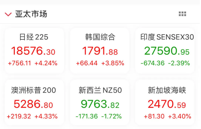 4月6日,亚太股市全线收高。日经225指数涨4.24%,韩国综合指数涨3.38%,新加坡海峡指数涨3.40%,香港恒生指数涨2.21%。