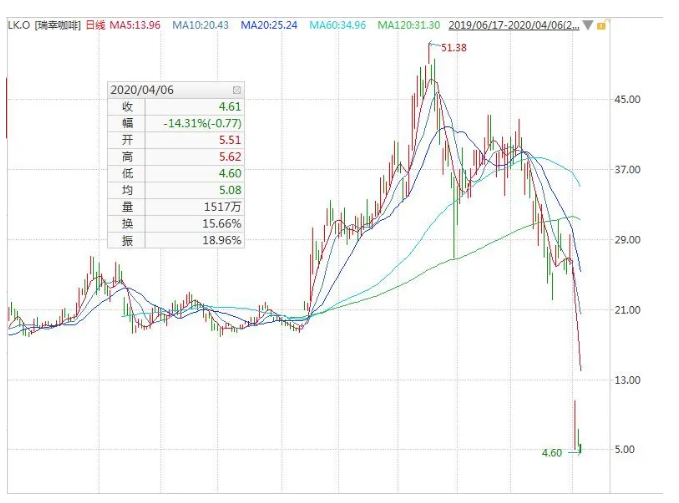 瑞幸咖啡,小幅高开后快速跳水,延续前两个交易日跌势,转跌逾14%,盘初跌近20%,刷新历史新低至4.6美元,市值缩水至不足12亿美元。