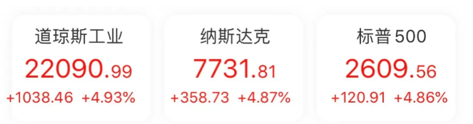 美股大幅高开,道指涨超1038点,标普500指数涨4.86%,纳指涨逾4.87%。