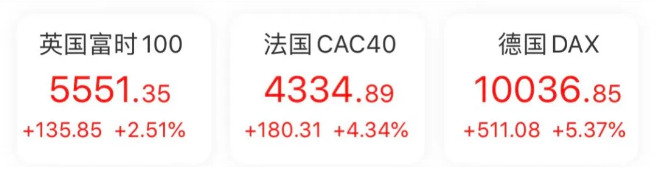 截至发稿时,英法德三国主要股指涨幅均超2%。英国富时100涨2.51%,法国CAC40涨4.37%,德国DAX涨达5.37%。