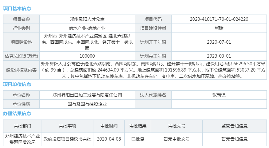 大河财立方消息 4月8日,据河南省投资项目在线审批监管平台发布,郑州昇阳人才公寓项目获郑州经济技术产业集聚区发改局批复。