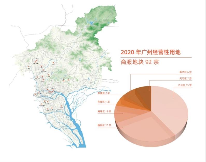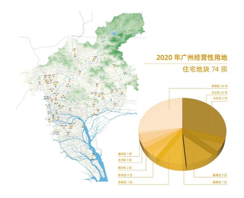 4月9日,广州市规划和自然资源局发布了《2020年广州经营性用地供地蓝皮书》,对收录蓝皮书中的173宗土地进行了详细介绍,其中住宅用地74宗(449.2公顷),商服地块92宗(153公顷),其他地块7宗(44.2公顷)。金融城起步区、琶洲互联网创新集聚区、白云新城商务区、番禺南站片区等区域是商服用地的主要分布区,而住宅用地则主要分布在白云、增城、番禺、花都等区域。