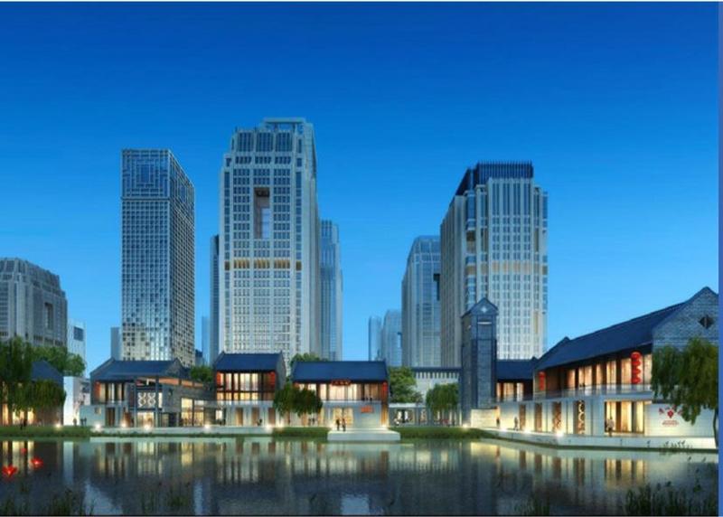 金融城的水街建筑与公共空间的景观建筑参考传统岭南建筑的性质,结合照壁、山墙、漏窗花墙、灯笼、木格栅、雕花玻璃等构件,形成虚实结合的建筑空间。戏台建筑采用四角塔楼的方式形成良好的视角观赏效果,浓重的中国红体现传统戏剧特色。门楼结合商业街的节点设计,墙头采用锅耳式山墙还原岭南符号特征。